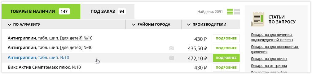 можно только товары, которые есть в наличии в аптеках.